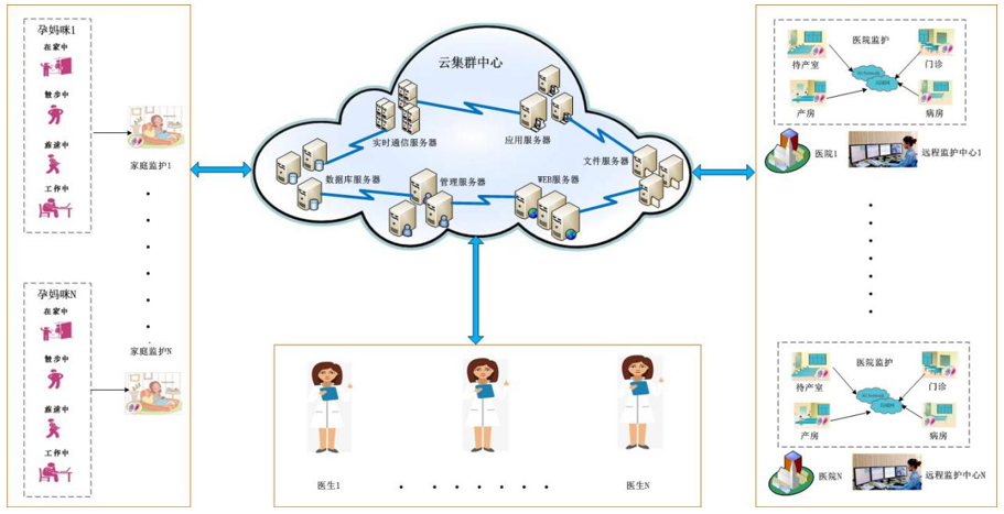 系統(tǒng)由遠(yuǎn)程監(jiān)護(hù)工作站一套、遠(yuǎn)程監(jiān)護(hù)終端設(shè)備MD1000C型胎兒監(jiān)護(hù)儀若干臺(tái)、樂福孕媽APP、下級(jí)醫(yī)院胎兒監(jiān)護(hù)設(shè)備MD9801型胎兒監(jiān)護(hù)儀組成??梢詫?shí)現(xiàn)上下級(jí)醫(yī)院醫(yī)聯(lián)體遠(yuǎn)程監(jiān)護(hù)遠(yuǎn)程會(huì)診以及遠(yuǎn)程家庭胎兒監(jiān)護(hù)。